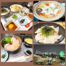 淡路島で晩ご飯も 明石鯛御前 最初は丼で次は鯛茶漬けで 淡路島玉ねぎ天ぷら 淡路鰆御前 こちらはシンプルに丼で 三年とらふぐうどん 淡路島名物の三年とらふぐの身がたっぷり 私は↑を食べたよ 美味しかった〜 明石海峡大橋と観覧車が見えたので📷 一日中淡路島で遊び食べ楽しみました 暖かくて過ごしやすかったよ〜🎶 綺麗✨ 12/7
