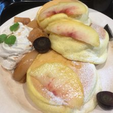 あいにくの 雨模様! 最近 気持ちよく 晴れたことないなぁ⤵︎ せめて スイーツで 華やぎましょう♡ 季節のフルーツのパンケーキ! 真ん中の桃 色が…⤵︎ 味は美味しかったよん(o^^o)