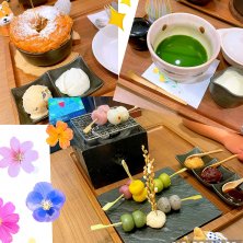 ここ最近は毎年ここに行ってる。子連れフレンドリーで眺めも良くてよいレストラン 👦👦がここの七福団子が大好き。自分で七輪で焼いて、お好みでみたらしやあんこを付けて食べるのが楽しいらしい。 去年とはフレーバー違いのほうじ茶スフレパンケーキと自分で立てる抹茶ラテ