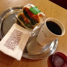 デュッセルドルフからの飛行機は殆ど寝てしまったので、腹ごしらえは皆無で結構な空腹に。。でも、スタジアムまでで絶対食べるから、ホテルそばの駅構内カフェで簡単に。。 これで5ポンドくらい。 まぁ1ポンド、100円くらいのノリと。