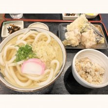 ずーっと行きたかった讃岐うどんのお店にやっと行けました😆 13時を過ぎての訪問だったので、特別メニューのサービスセットを注文しました🌱 かけうどんかぶっかけうどんが選べて、白ごはんと揚げ物、漬物がセットになっています❣️ この日はかけうどんが終了していたので、ぶっかけうどんをいただきました😋 白ごはんはなぜか炊き込みごはんに…? 白ごはんも終了していたのかもしれません🙄 こんなにコシの強いうどんは久しぶりに食た〜🙊💕 飲み込むのが困難なくらい😝笑 次はかけうどんが食べたいです💓