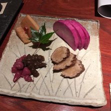 お通し 四品 親鶏のコリコリ わさび豆腐+生姜+ザーサイ アサリ煮 ガーリックライス焼きおにぎり (カリカリ焼きたて)