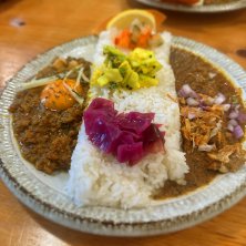 カレー欲が収まらず社長ランチでスペシャルキーマカレー❗️大盛りにしたら⛰️が来てびっくり、カレー以外にも色んなものが載ってて飽きずに食べられる👌🏻