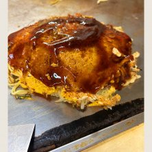 お好み焼き〜( ^ω^ ) うまーーい😋 久しぶりのお好み焼き ビール🍺二本 ビール進む あ、青のり。。。 89歳のおばぁちゃんが焼いてる