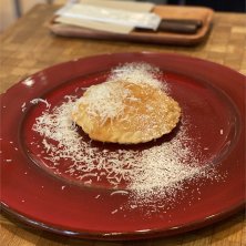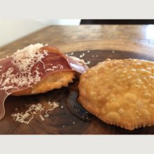 イタリア、サルデニア地方の伝統菓子セアダス。 パスタ生地のサクサク感と中のたっぷりとろーりチーズがはちみつと合う! 手前が食事系の生ハムを乗せたセアダス、奥がデザート系のはちみつを乗せたセアダス。デザートワインと一緒に。 日本で唯一セアダスを作ってるお店として、イタリアの新聞にも載ったらしい。