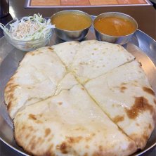 チーズナンセット🍛🇮🇳🫓🐟🐔 巨大なナンにチーズがたっぷり詰まっていて、これだけでお腹いっぱいになります カレー2種は酸味と辛味の効いたサバカレー、ジンジャーを効かせたチキンカレーを選びました✋