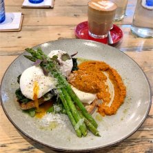オリーブパンの上には スイスチャード、ポーチドエッグ、ブラッターチーズ(ポーチドエッグのような右の丸いの) 季節のアスパラガス添え😋 ベジタリアンですが ボリュームたっぷり🧀✨✨