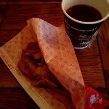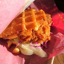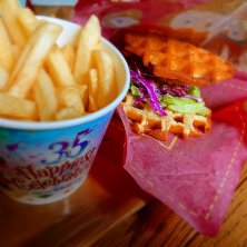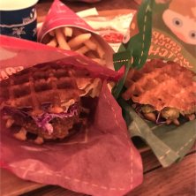 今日は晴れて気持ちいい! ウッドチャックでおやつを! ワッフルサンドフライドチキンいただきます!(*^^*)