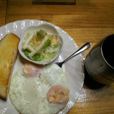 おはようございます☀️😃 今日は朝早くからモーニング食べてファミリーセール行ってきます‼️ ここのお店はモーニングには珍しく目玉焼きがあるから好きです❤ アイスコーヒー400円也