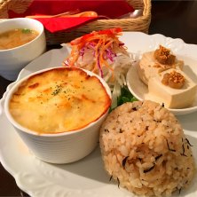昼食✳︎ウィークリーランチ ひじき御飯♡クリームグラタン♤豆腐田楽♢サラダ♧豚汁
