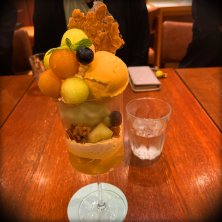 アイスケーキのお店 グラッシェルさんで フルーツパフェ💓 上から ピスタチオのクリーム アプリコットのアイス 生のグレープフルーツ グレープフルーツソルベ 久しぶりのパフェ とっても美味しかった♡