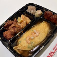 天津飯弁当 鳥の唐揚げ、海老天、焼売、海老焼売 天津飯、肉団子の甘酢餡かけ これだけ入って千円で、注文してからの出来立てアツアツって買ってしまう。プラスチックのレンゲは10円になってた。もちろんおばちゃんは家に洗ったレンゲがあるのでお断りする。😆👍