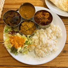 今夜は南インドのカレー、前から気になっていた錦糸町のお店です。 このNon Veg Thaliは、2種類のノンベジカレー、2種類の野菜カレー、ラッサム、チキンティッカ、プーリー、バスマティライス、ナン、サラダ、デザート、ラッシーのセットで1,800円。 ノンベジカレーはチキンとマトンを選びました。野菜カレーは日替りで、ポテトとドライグリンピース、ナスと豆です。 スパイスが適度でどれも美味しいですよ(^-^)/ さすが、食べログの百名店に入るだけのことはあります♬
