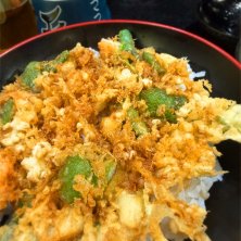 かき揚げ天丼。 ランチで900円とお得。 サクサクかき揚げが美味しかったです。