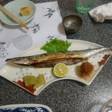 さんま塩焼き。ハラワタ抜いてもらいました。それにしても美しい真っ直ぐな姿です~