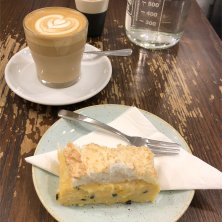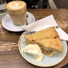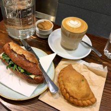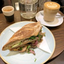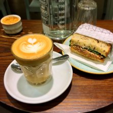 ローストベジタブルのハーフバゲット& caffè e llatte (๑´ڡ`๑) なすとズッキーニのローストにフェタチーズ、ペストの組み合わせは大好き ランチ前に 職場の同僚が カレーパフを差し入れてくれたので それを持ち込みで ꒰๑॔˃̶ ◟◞ુᵒ̴̶̷๑॓꒱ 苦笑