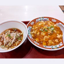◆麻婆丼+ミニらぁ麺 640円 麻婆丼は餡に片栗粉が少し多めなのかプルンとした餡で辛さはマイルドな感じです。自分の好みとはちょっと違う感じの麻婆丼です。 ミニらぁ麺はもやしと豚挽肉がのったシンプルな醤油ラーメンです。税込640円はコスパ良いメニューです。