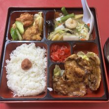 大口駅近くの『中華定食あらた』で晩御飯です。 ラーメン600円、定食も800円台とリーズナブル。お弁当メニュー3種類から焼肉弁当を注文。おかずは焼肉・唐揚げ・八宝菜かと思ったら下に麺。おかずがたくさんの美味しいお弁当です。 焼肉弁当 1,200円