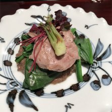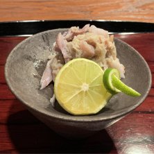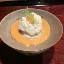 温the酢の物!熊本産トラフグの酒蒸し! うむ!このあん肝ポン酢ソースが、、、なかなかフグとの相性最高じゃないか! ヒロキめ、、またまた腕を上げたな、フフフ