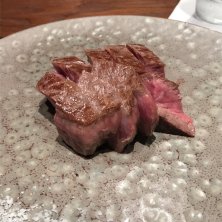 本日は佐賀牛の姫肉A5ランク肩三角赤身のお肉でございます。塩、わさび、レモン塩麹と、お好みでお召し上がり下さいませ。噛めば噛むほど旨味が広がります。