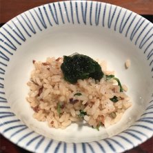 アオリイカのゲソを3時間くらい煮詰めて出したお出汁をセリと合わせたガーリックライス。 浜名湖の生海苔と合わせて食べると味と香りと口の中に広がってたまらない!