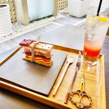 いちごのミルフィーユ🍓いちごスカッシュ はさみでリボンをカット🎀 沢山写真撮ったけどとりあえずこの1枚❤️ 久々 めちゃ良い写真なのに… ミルフィーユは即完売なので待ち合わせ前に時間有ったから1番目に並べました 50代以上の夫婦?カップル?が奥さん?彼女?の店の前の写真撮りたいけど私が居るから上手く撮れない けど並ぶから私もどけない 次に20代ボーダー男子が並ぶとカップルが私達のが先だと私の後ろで言い合いになる 結局2対1で男子負ける 3組しか入店出来ず、その人達と私 変な雰囲気💦