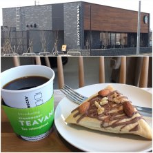 春のお彼岸 連休で新潟に帰省中 新潟最新スタバ 女池(めいけ)店へ ( 2/3 オープンしたて ) 郊外ロード沿い戸建タイプで 駐車スペースたっぷり 野外テラスも 店内は高い天井で広びろ空間 黒いタイル貼りの壁に テーブル、椅子はウッディ 真ん中にソファーコーナー がある 今のスタバの インテリアコンセプトで 居心地抜群! 本日の「ドリップコーヒー」 ¥280と 「アメリカンスコーンナッツ」 ¥270を ( 発酵バターを使った生地に チョコレートチャンクが入った スタバの定番スコーン )