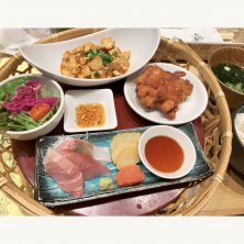 中華定食の海老チリ定食、1080円。 海老チリ、布袋式ザンギ、ご飯、スープ、サラダ、刺身3切れ、明太子など。 ぷりっぷりの海老と少し辛めのチリソースが激うま‼️ 定番の布袋式ザンギは熱々で肉汁もたっぷり。刺身は大トロ、シメサバ、タイの3点どれも新鮮。 リーズナブルで美味しい、満足度100点満点のランチでした。
