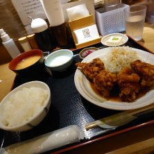 早めの昼食。唐揚げが旨いと聞いたので来てみました(^^) 確かに濃いめの味付でご飯が進みます(^^) ご飯おかわり自由もとても嬉しす(^^)