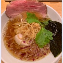 蛤の醤油SOBA。 蛤の出汁がきいた淡麗で上品な味わい。 鶏チャーシューが2枚と蛤が5個入って中身も充実。とても美味しかったです。 ランチ無料サービスの焼きおにぎりは、スープで崩して食べるのが正しい食べ方です(^_^)v