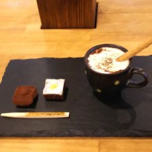 冬のショコラトリオ🍫 ホットチョコレートにはスパイスが振りかけてあって、シナモンスティックでかき混ぜて飲みます。 甘さを抑え目で、お酒の薫りがする【大人のホットチョコレート】です。 これ美味しい😋でも期間限定で、もうすぐ終了😅 森の中にあるので、新鮮な空気もごちそうさまでした😉