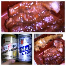 フィリピン出張 マニラでトランジット サンミゲルライトは飲みやすい。 ポークバーベキューは 甘めの食べやすい味。
