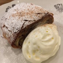 チェコ料理のお店で本当の〆? アップルシュトルーデル。 アップルパイ的な。 パイと違って、生地を折り畳んで層にするのではなく、生地を重ねて層を作るんだとか。 リンゴが多くておいしい。