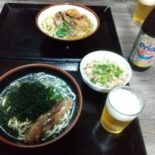 沖縄でおそば食べました☺️ 公設市場の近くで、アーサ入りと、 三枚肉ソーキそば、ジューシー オリオンビール🍻 安くてうまい! 海ぶどうとかジーマミー豆腐、もずくをお土産にしました。帰ってから頂きます~