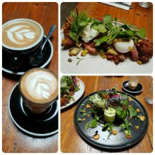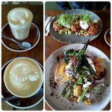今日のランチ。私が食べたのは右上のSummer salad - broad bean falafel coated in sesame seeds served on babaganoush with char-grilled avocado, asparagus, spring onion, freekah, picked cauliflower and beetroot salad. とても美味しくて、ヘルシー。健康オタクのテンション上がりました (*^^*)