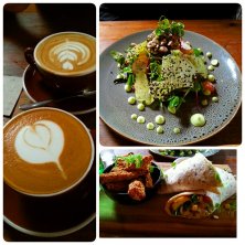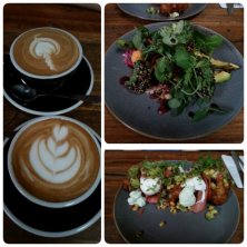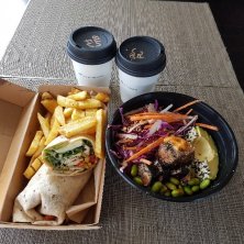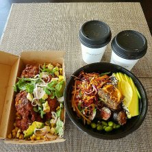 *Jalapeno corn fritters - charred corn, fried halloumi & avocado salsa, lime & coriander labne, aioli & pickled shallot salad *Poke bowl - quinoa, kimchi & salmon sushi, avocado, edamame beans, black rice, asian inspired slaw & okonomiyaki fritter