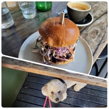 今日は振休を取ったので、わんこ🐶と一緒に遅めのランチでカフェに行きました。このバーガー、やっぱり美味しい😋 spiced lamb adana on hummus with shanklish, fried egg and a tahini dressed slaw in a brioche bun