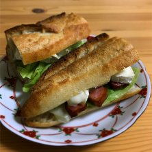 今晩は、バゲットにレタス・ベーコン・カマンベールチーズをはさんで♬ ここのお店のバゲット、本当に香ばしくてクセになります♡ そしてレタス、最近は1玉98円とか、安くなりましたね。一時期は400円近くしていたので、贅沢に使えて嬉しいです\(•ㅂ•)/♬