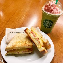 ❀ スモークハムとチーズのサワードー トーストサンド ❀ グリーンティー & ストロベリーブロッサム フラペチーノ トーストサンド、チーズトロトロで美味♡ ハムもチーズもたっぷりでかなりのボリューム コーヒー飲み過ぎの傾向なので 季節のフラペチーノ 私にはやや 甘い ( ꒪Д꒪)