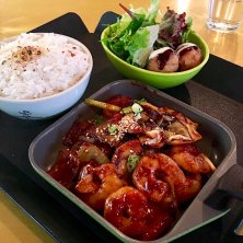 海老のブルゴギ、サラダ & たこ焼き、ライス ( *´꒳`*) スパイシーなチリソース味♡
