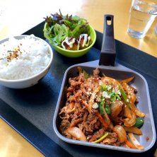 昨日のランチは スパイシー🌶 ビーフ ブルゴギ サラダ たこ焼き添え ご飯🍚