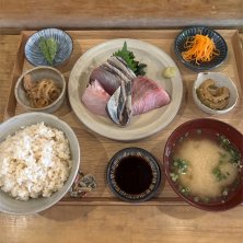 ランチは松陰神社前の『食堂めぐる』。 注文は刺身盛り合わせ定食、刺身は4種類で3切れずつ。味噌汁はあら汁、小鉢も4種類で切り干し大根、オクラ、にんじん、ゴーヤ。九州の甘めの醤油でカツオなどのお刺身を美味しく頂きました。 刺身盛り合わせ定食 1,800円