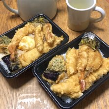 天どーーーん😆海老、イカ、めごち、穴子、茄子、鶏、ブロッコリー。 手前は私で奥がオットさん。同じ天丼だけど私は海老が2本ある代わりに穴子無し。息子は海老天丼(写真無し)で海老4本だから交換したわけでして。息子は穴子が好きなの。 地味めに頭痛なので夕飯は買ってきてくれた。作れないほどじゃないけど気分が乗らないからね!😆←偉そうに言うことか 今日からお店やってるから蒲田はなんだか賑わってた!と帰ってきた。雨も上がったしお店も客も張り切ってるのかな。やっぱね、街はそれなりに賑わってないと☺️