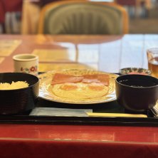 ゴルフ場の朝ごはん。 ごはん、味噌汁、お漬物の基本セットに焼き魚と生玉子を追加。