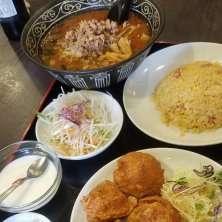 『鶏の唐揚げ定食』980円 コスパ最高! 大きな唐揚げ5ケに一人前のチャーハン、ラーメンなどがついてこのお値段。 みんなでシェア♪