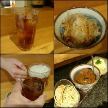 夕方から病院で ぶち待たされて20:30完了😵 からの出撃‼️ 血液検査の結果が悪かったので ウーロン茶で反省(>。<) 今宵はKちゃん料理♡ オニオンスライス おばんざい三種盛り Kちゃんと乾杯♪(*≧∀≦*)b