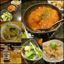 昨夜の2軒目(*´ω`*) ♡様とKちゃんに せこ蟹のお土産を持って♪ ジムビームハイボールで乾杯♡ お通しは チンゲン菜 豆苗 ちくわの ポン酢あえ おばんざい3種盛り 小松菜のお浸し 鶏のトマト煮 豚肉とれんこんの甘辛炒め