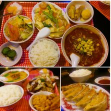 山東飯店 (名古屋市天白区原) こちら:青椒肉絲定食(台湾味噌ラーメン) 向こう側:ニンニク茎炒め定食(麻辣麺) 微妙に違うけど絵面はほぼ一緒笑 ごはん半分、食べてもらいました。お腹いっぱいごちそうさま!