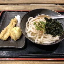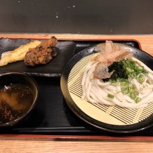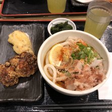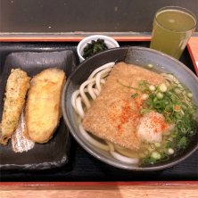 肉キツネうどん レギュラーサイズ ちくわの天ぷら、唐揚げ 久しぶりに来たら、無料のトッピングコーナからワカメがなくなり「わかめうどん」がメニューに追加されてた(´゚艸゚)ププッ レンゲは普通使わないですよね(笑) ランチbuddyちゃんが 持って来てくれたので、使ってみた