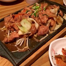 バーベキューチキン (๑´ڡ`๑) この他にキムチのパジョンチーズ入り、ストロベリーマッコリ をいただきました〜〜♬ 個室っぽく 仕切られてて、周りを気にせず楽しめるお店で、ちょっと日本の居酒屋を思い出しました 長〜い1日が終わったぁ